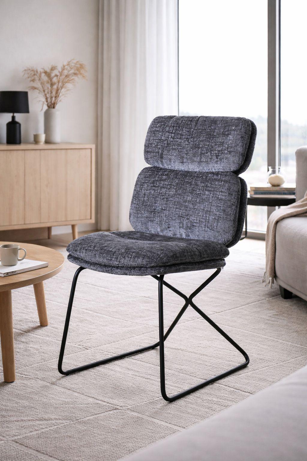 Chaise robuste, garnie d’un tissu tendance blanc ou antharcite et facile d’entretien . Dimensions: Largeur: 46 cm / Hauteur: 86 cm Profondeur: 64 cm
